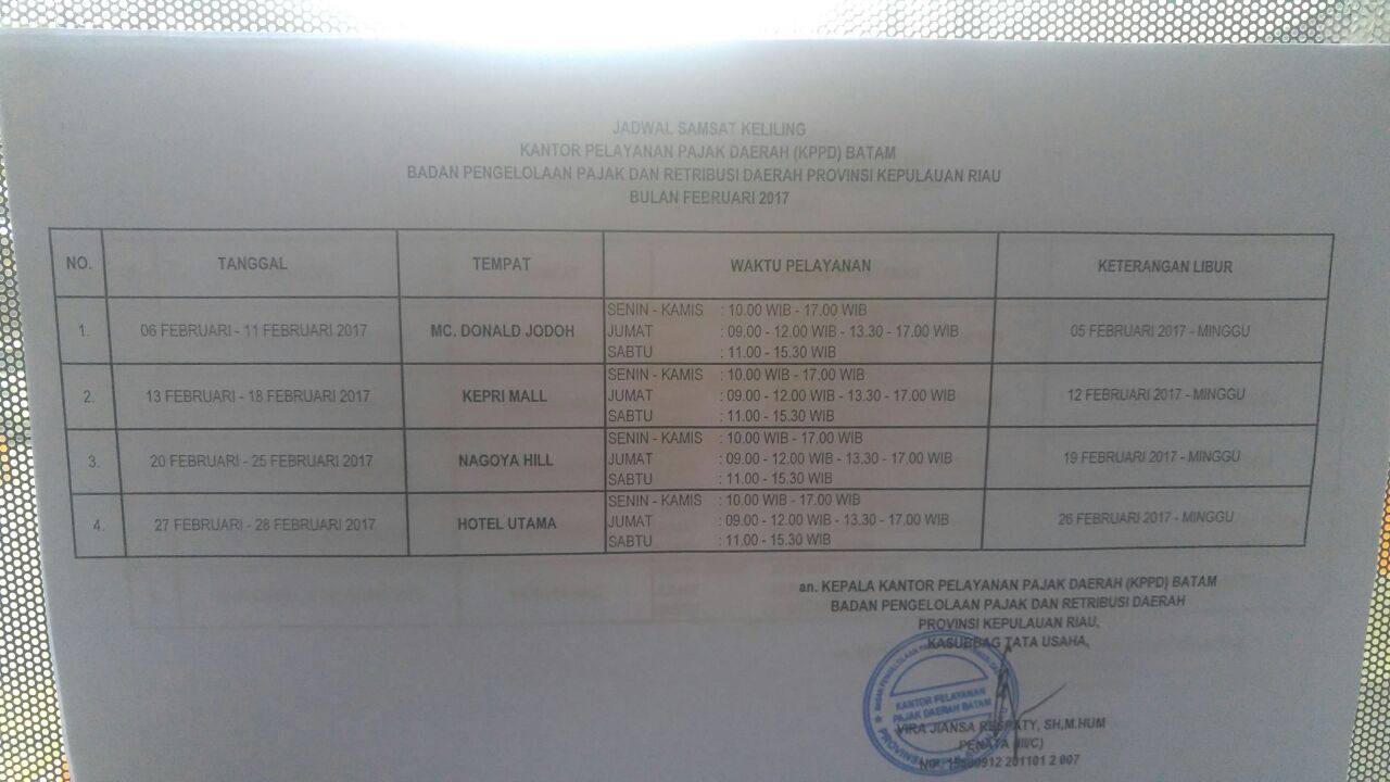 Untuk jadwal Samsat Keliling untuk wilayah Provinsi Kepri selama bulan Februari 2017 adalah sebagai berikut: